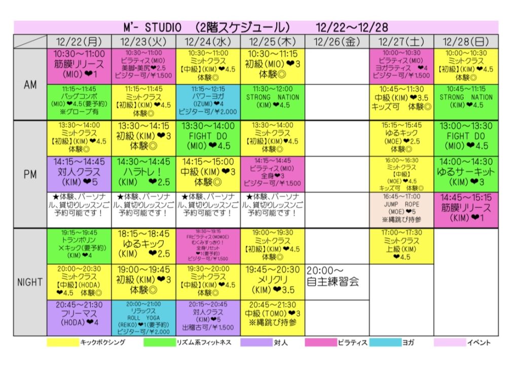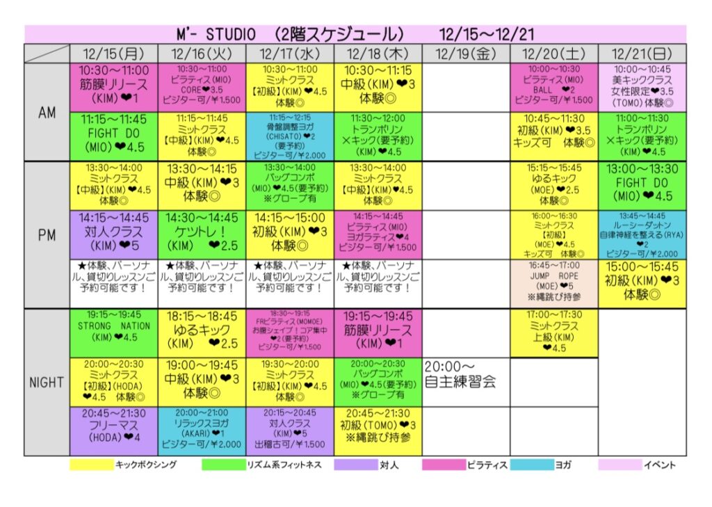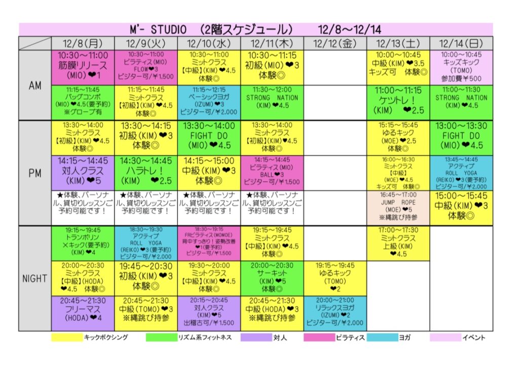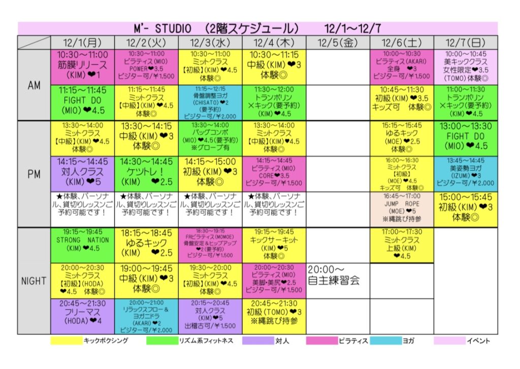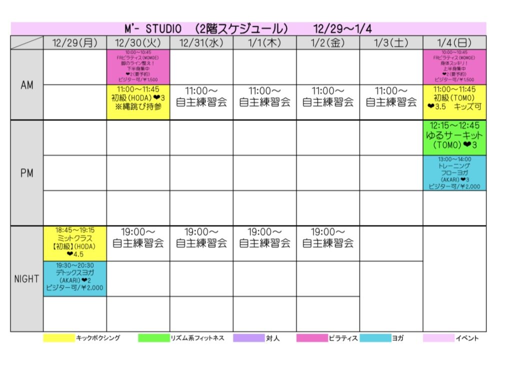 こちら2階スタジオ(M’-STUDIO)のスケジュールです☆