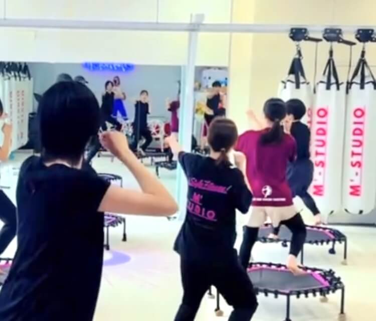 音楽に合わせて、トランポリンの上で行うエクササイズです。