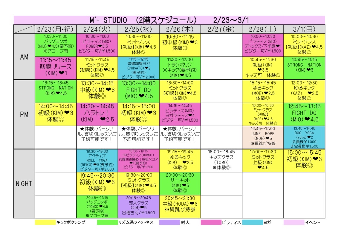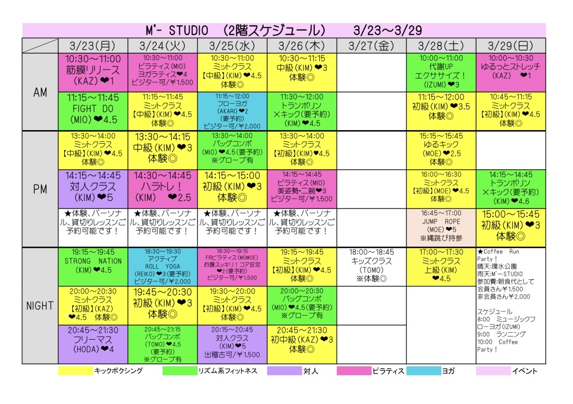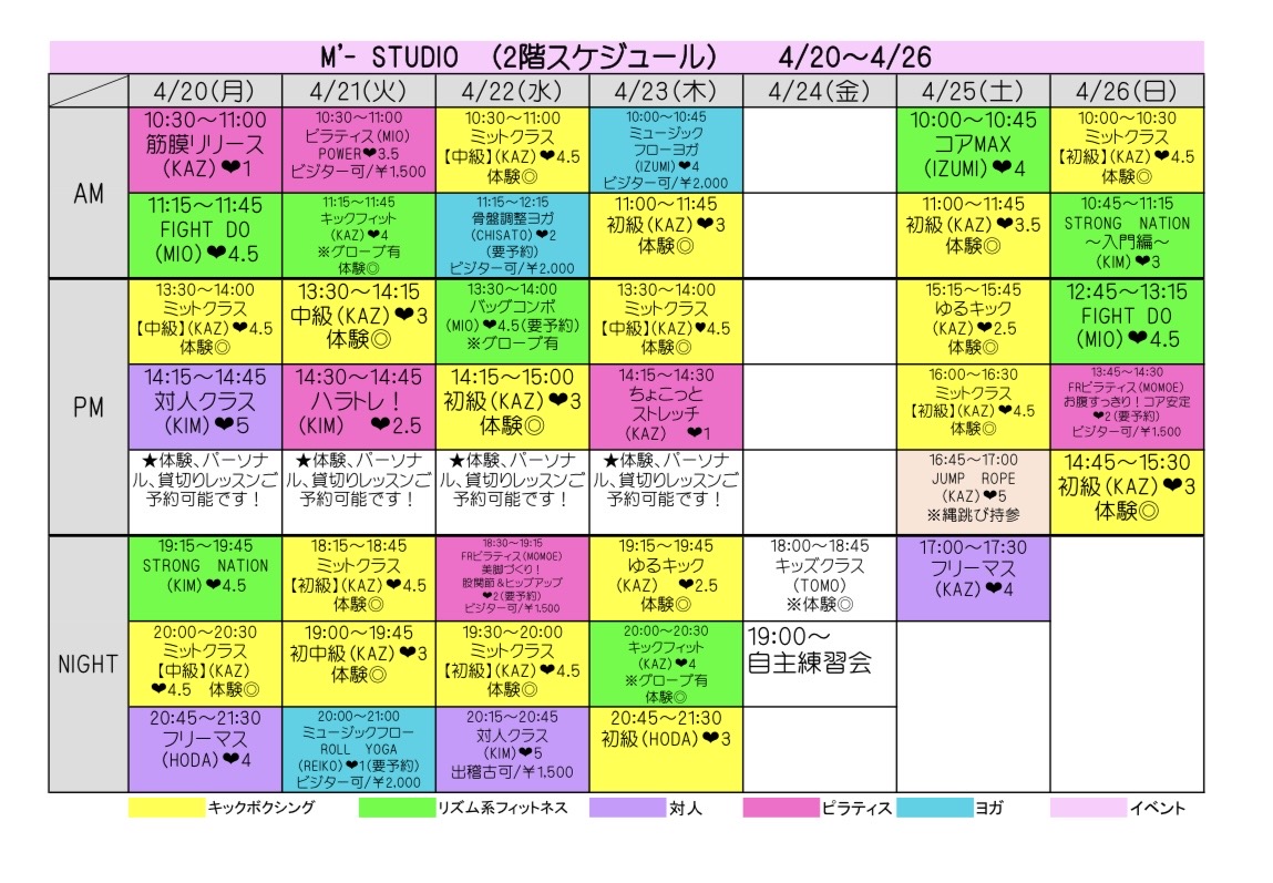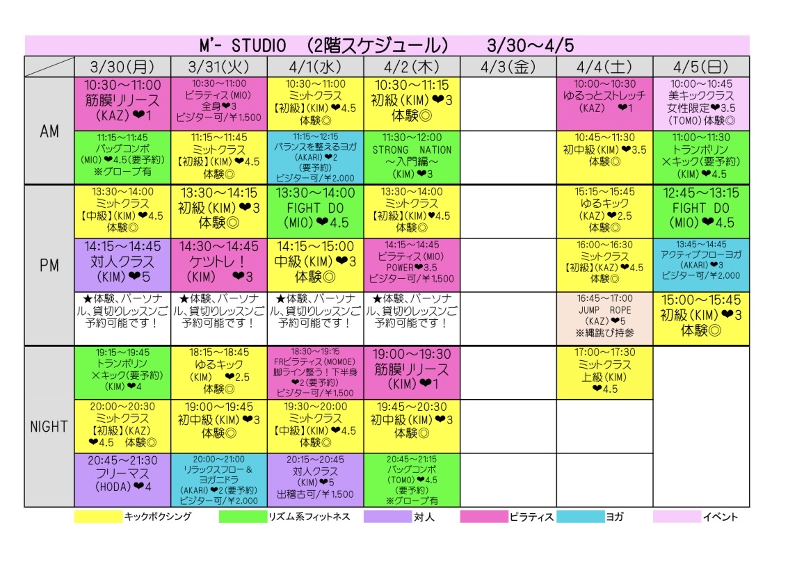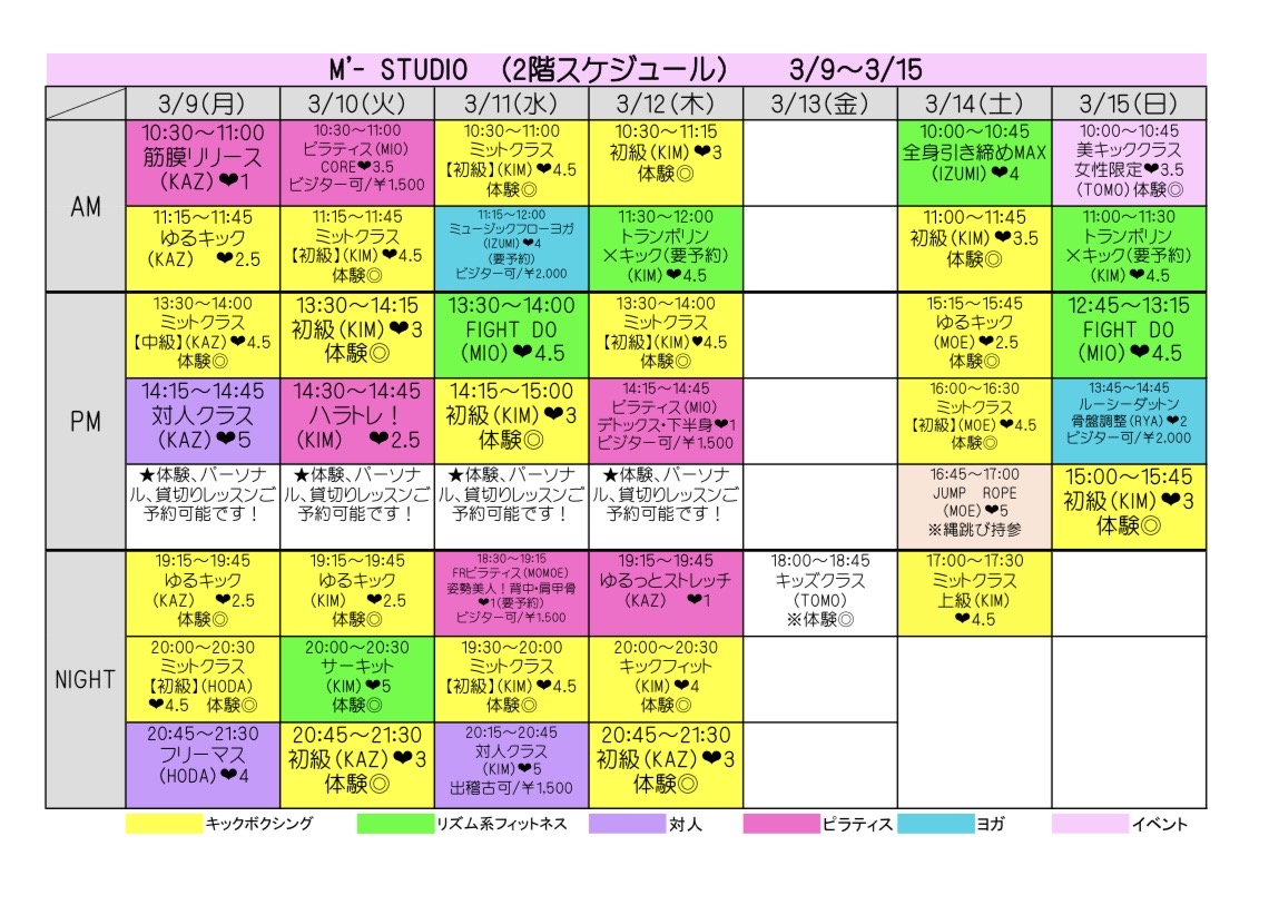 スケジュール表の「体験◎」と表記のあるクラスを体験いただけます。