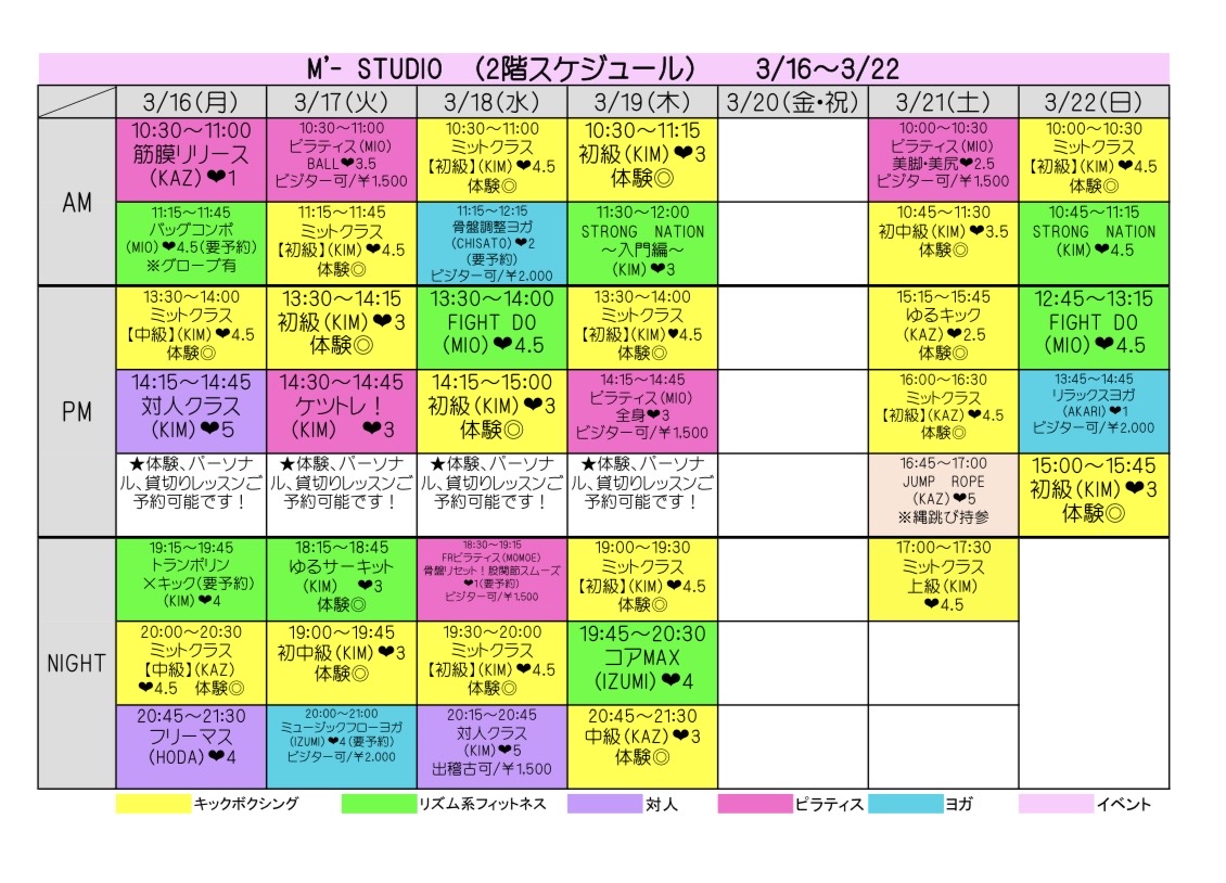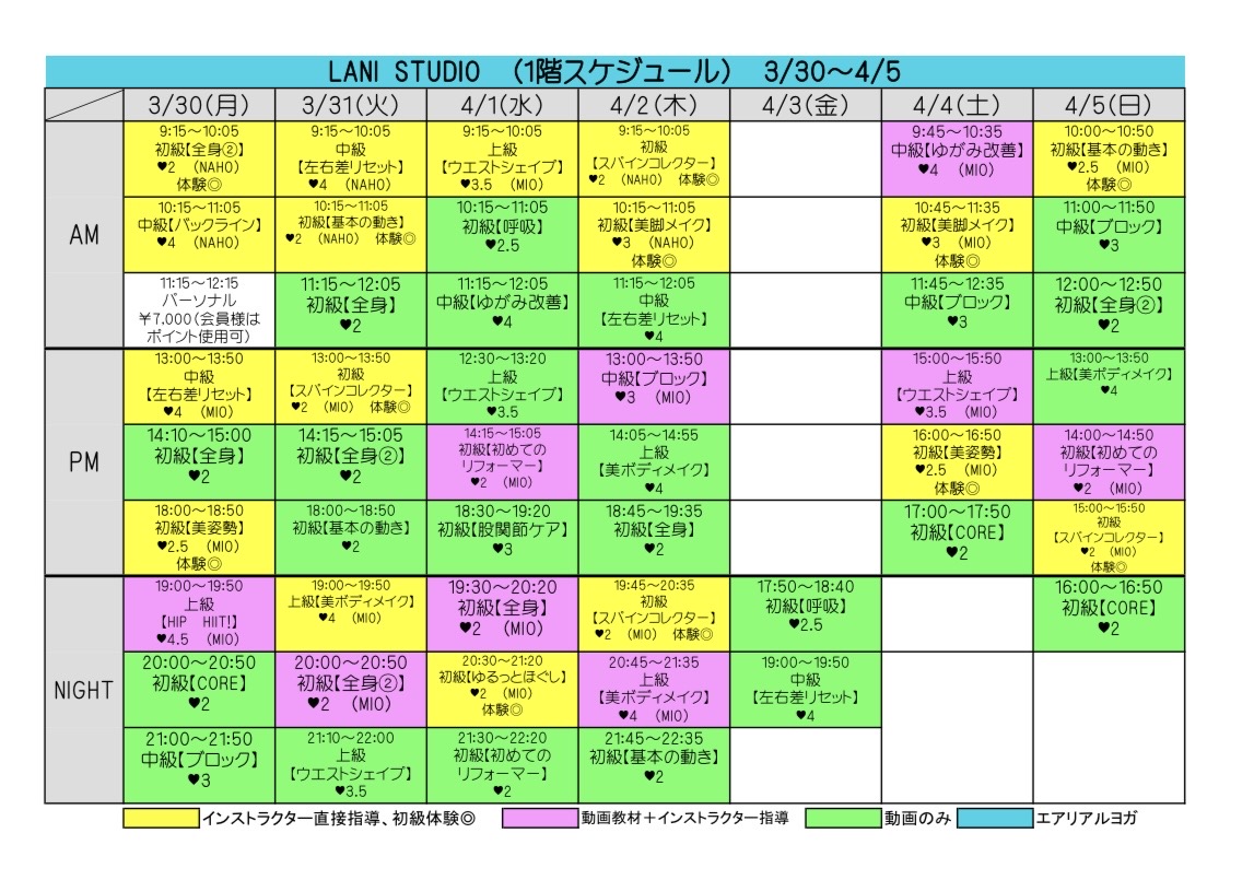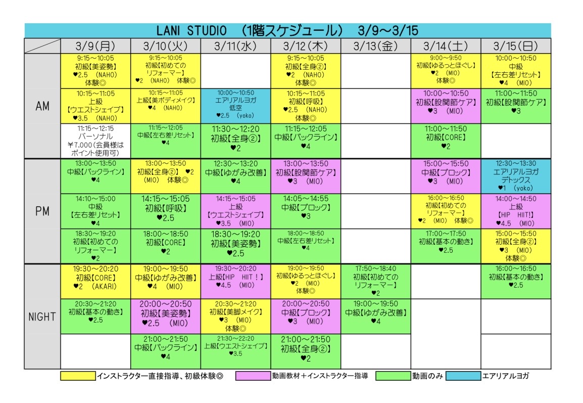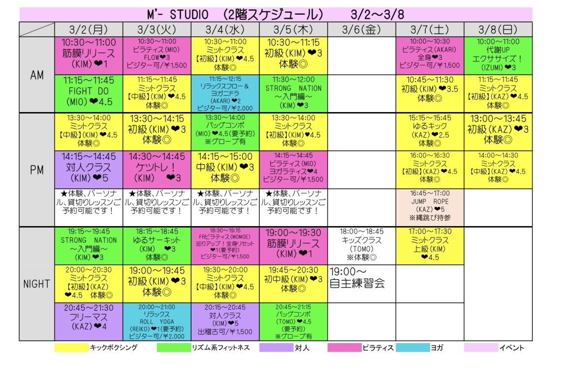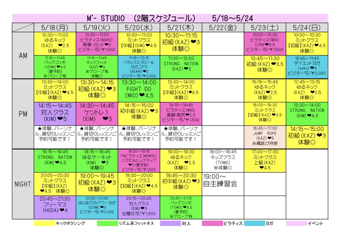 スケジュール表の「体験◎」と表記のあるクラスを体験いただけます。